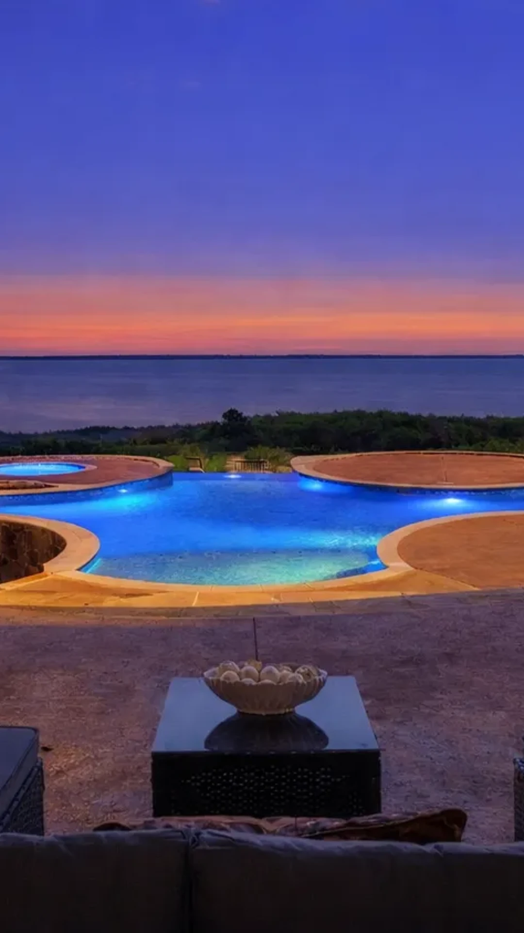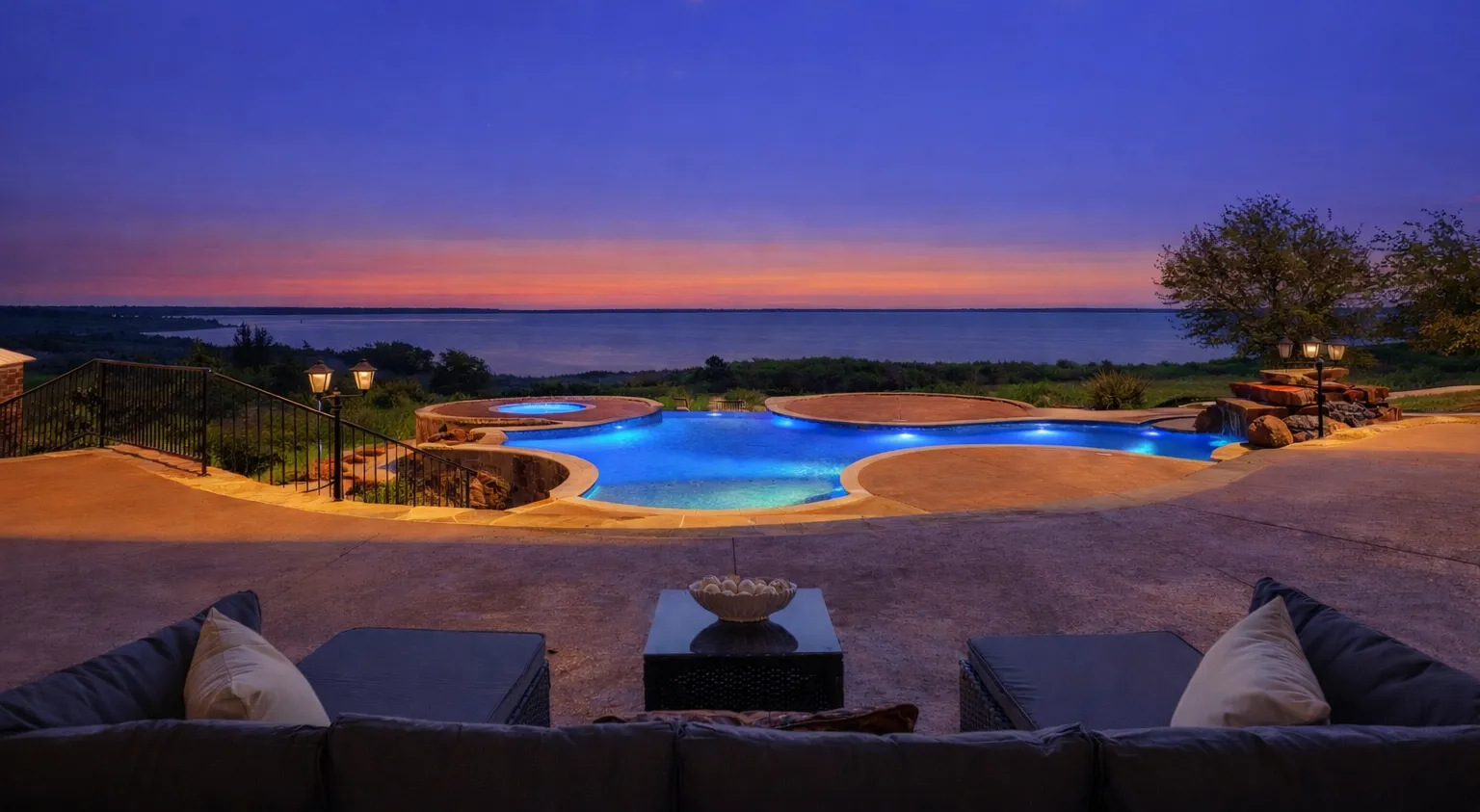 Outdoor oasis with lakeview pool and bubbling spa.
